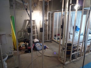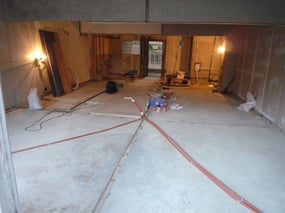 コンクリートの床に下地材を張り、仕上げのフロアを貼ります。