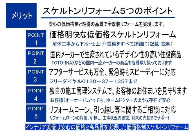 室内を一度スケルトン(骨組)の状態にし、天井・壁・床の下地から、給排水・ガスなど配管に至るまで全面的にリフォームすることを指します。部屋中の壁・天井・床・キッチンやユニットバスなどの設備機器も全て取り払い、コンクリートむき出しスケルトン状態から始めるため、間取りがより自由に変えられる上、断熱性の向上や、老朽化した配管・配線も取り替えることが出来ます。